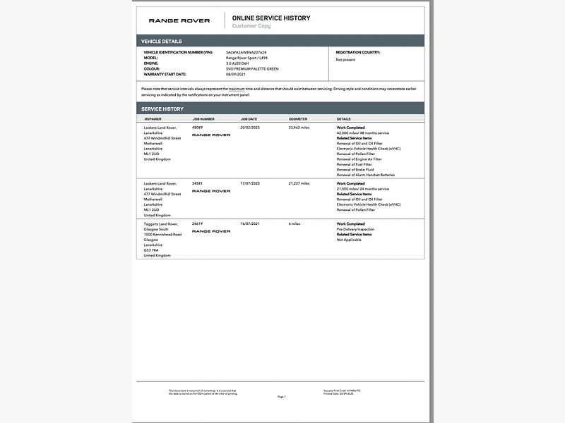 This 2021 Land Rover Range Rover Sport D300 Autobiography Dynamic is a superb example, having had only one owner since new. Powered by a robust 3.0L Diesel engine and featuring a Four Wheel Drive drivetrain, this Euro 6 compliant vehicle offers impressive performance, accelerating from 0-60mph in just 6.9 seconds. Its Autobiography Dynamic trim level ensures a luxurious experience, complemented by notable features such as 22 inch alloy wheels in a striking gloss black finish, advanced Pixel laser LED headlights with signature Daytime Running Lights, and a 360 degree surround camera system for effortless manoeuvring. The sliding panoramic roof adds an open and airy feel to the cabin, while the large boot space provides ample room for all your needs. The inclusion of a Head Up Display keeps essential information easily visible, enhancing driver focus. For those who need to tow, this Range Rover Sport boasts a substantial towing weight of 3500 kg. These carefully selected features and the vehicle's single ownership history demonstrate a higher standard compared to other similar models, offering a refined and capable driving experience for any journey.