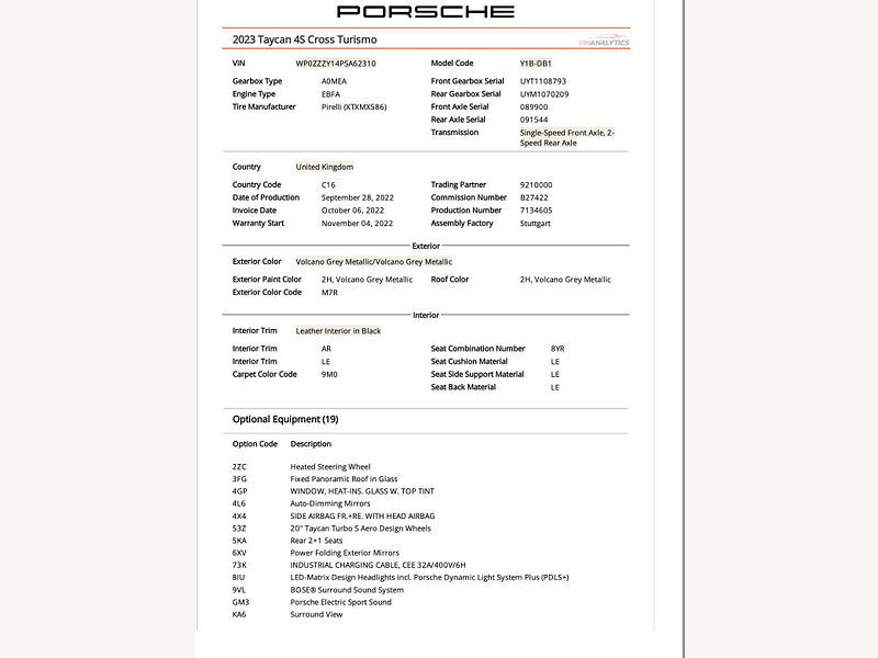 VAT QUALIFYING This 2022 Porsche Taycan Performance Plus 4S is a superb example, having had only one owner since new. This all electric, four wheel drive saloon boasts a substantial 93 kWh battery, offering a maximum range of 304 miles when new. It features exclusive black Matrix LED headlights with Porsche Dynamic Light System Plus, a BOSE Surround Sound System with 14 speakers and a 710 watt output, and a heated steering wheel for added comfort. Adaptive Cruise Control also enhances the driving experience. The Taycan Performance Plus 4S delivers exhilarating performance, accelerating from 0 to 62 miles per hour in just 4.1 seconds, demonstrating its superior capability compared to other vehicles in its class. For convenience, a full charge at home using a 7kW charger takes approximately 13 hours and 30 minutes, while rapid public charging can replenish the battery from empty to 80% in as little as 24 minutes, ensuring you can get back on the road quickly.